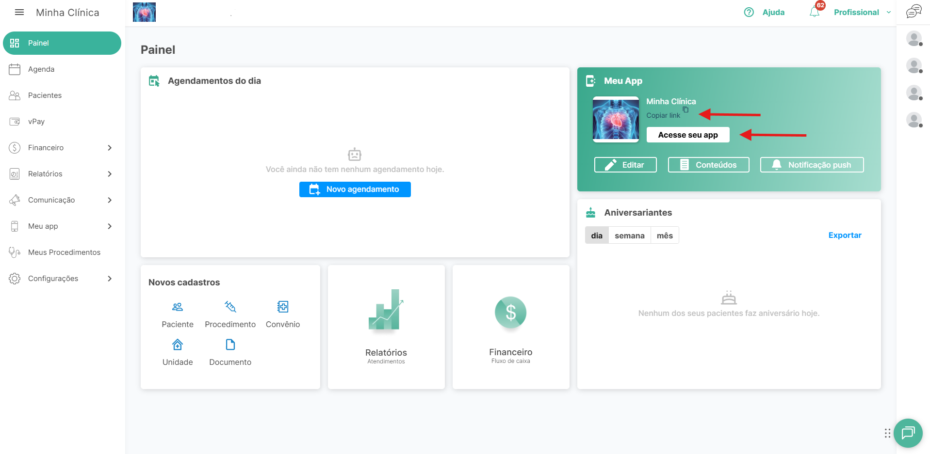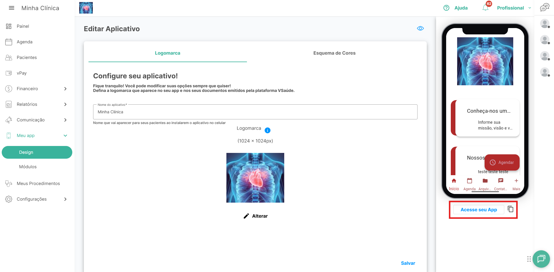 Nós disponibilizamos o link do seu aplicativo mobile na versão web no Painel inicial da Plataforma VSaúde ou em Meu App > Design > Acesse seu app.