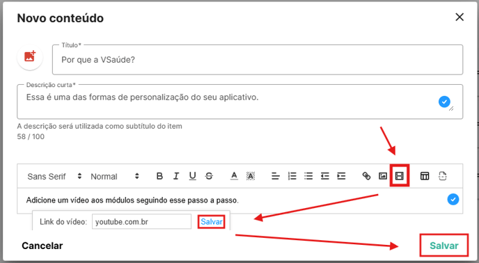 Para adicionar um vídeo, insira o título, a descrição e um texto. Em seguida, clique no ícone de vídeo para inserir o link do vídeo que deseja compartilhar com seus pacientes.