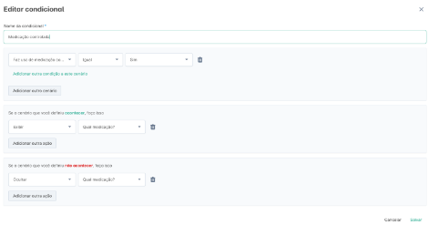 Como fazer essa configuração? Por exemplo: ''Faz uso de medicação controlada?'' Se marcar ''sim'', podemos configurar uma condição para ser exibido um novo campo perguntando qual a medicação, caso selecione não, nada acontece.