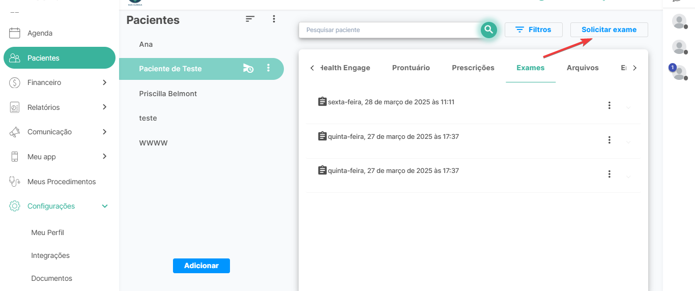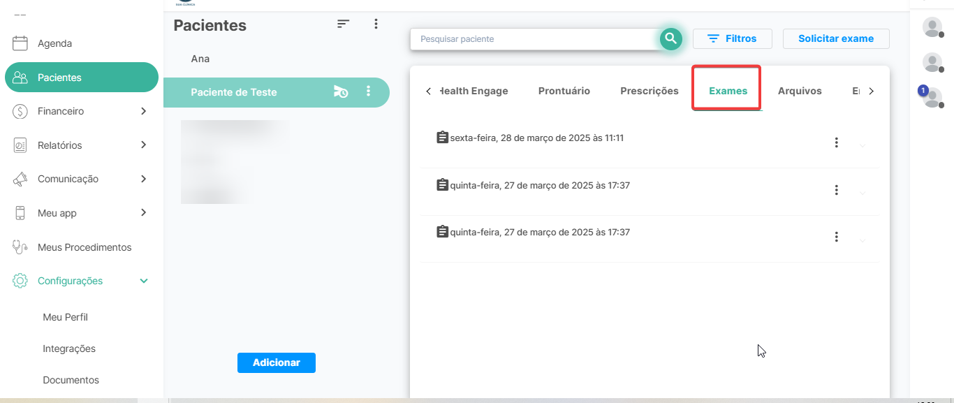 Dentro dos cadastros dos pacientes, basta selecionar o paciente desejado e clicar na aba Adicionar Exame.