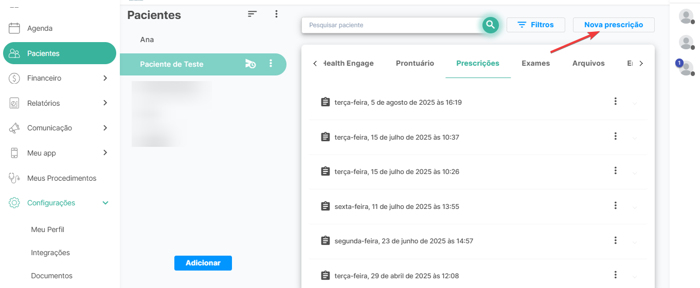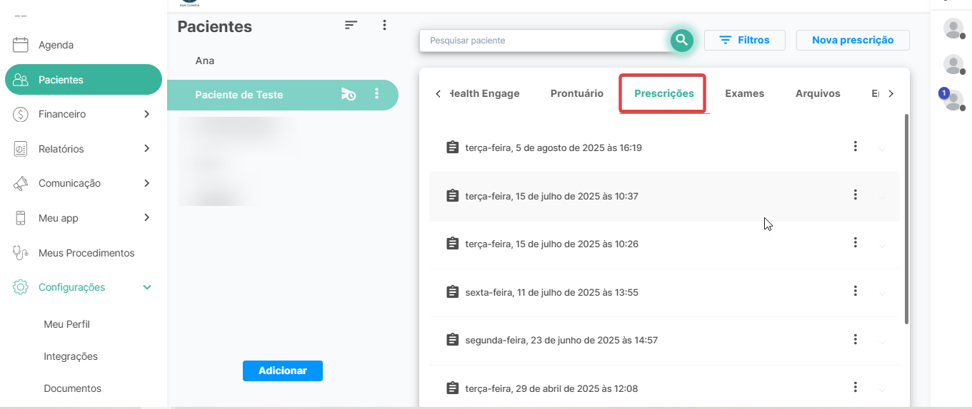 Ao acessar os cadastros de pacientes, basta selecionar o paciente desejado e navegar até a aba Prescrições.
