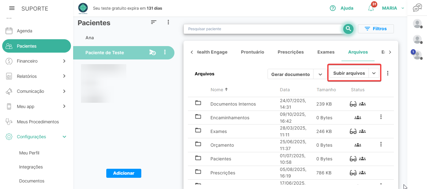 Caso você já possua algum documento ou arquivo previamente salvo em seu computador, também é possível realizar o upload dele dentro do cadastro do paciente através deste botão.