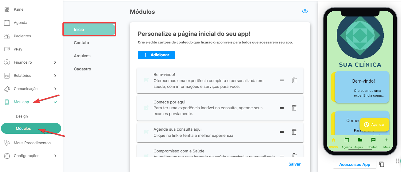 Os módulos foram criados para personalizar a tela inicial do seu aplicativo e aprimorar o contato com os pacientes. Com eles, você pode destacar informações relevantes, como seu corpo clínico, especialidades e outros conteúdos importantes.