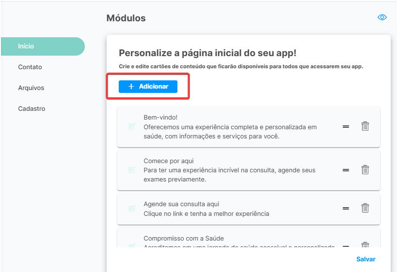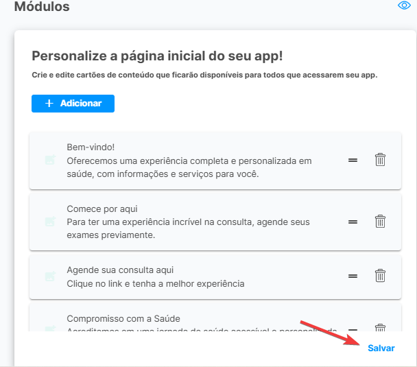 Se tudo estiver configurado como desejado, bastar clicar em 'Salvar' mais uma e vez e seus módulos estarão disponíveis no aplicativo dos pacientes ☺️