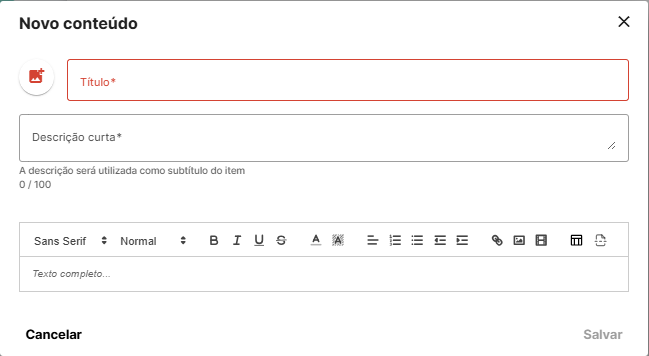 No texto completo você tem, à sua disposição, ferramentas de edição de texto para te auxiliar na construção, bem como botões disponíveis para adição de imagens e vídeos advindos do YouTube.