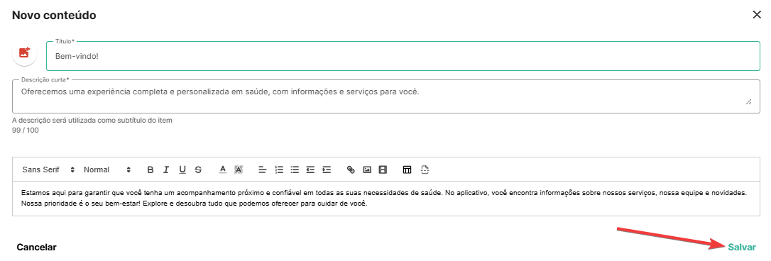 Será neste corpo de texto em que você colocará o conteúdo desejado que ficará visível e disponível para o paciente.