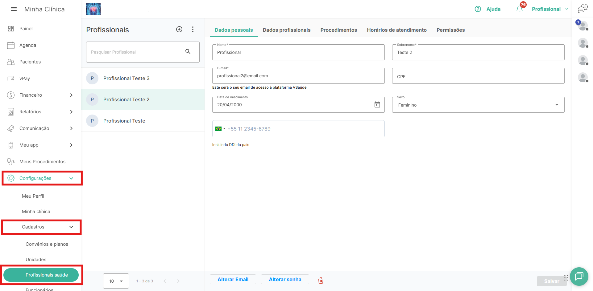 No menu lateral, vá até “Configurações” > “Cadastros” > “Profissionais saúde” e selecione o profissional que deseja excluir.