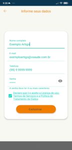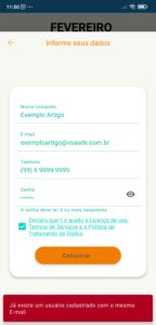Ao acessar o aplicativo e tentar criar um cadastro, o paciente irá se deparar com uma mensagem de erro, informando que o e-mail dele já foi cadastrado. Isto acontece, pois ao cadastrar um paciente diretamente na plataforma, será automaticamente gerado um usuário para que ele acesse o aplicativo, utilizando o e-mail informado no cadastro e uma senha padrão gerada pela plataforma (para consultar a senha padrão, basta entrar em contato com nosso suporte técnico).